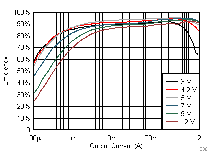 例如图中红色曲线表示输出电压为4.2V,通过查看这条曲线可以找到在不同输出电流的情况下转换器的效率。